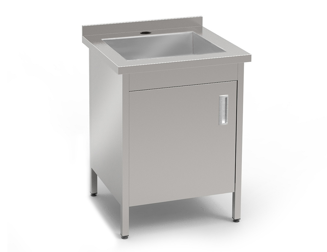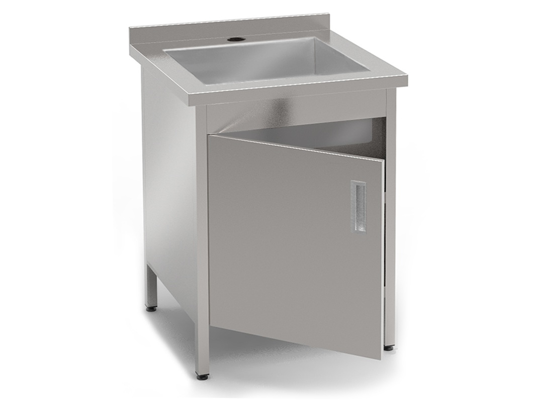 Столешница и каркас мойки-закрытой с дверью распашной выполнены  из нержавеющей стали. Ножки  регулируются  по высоте.